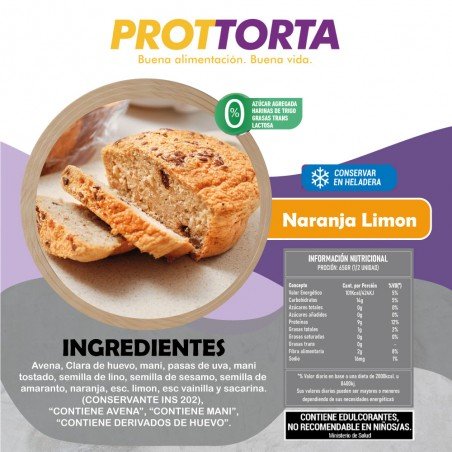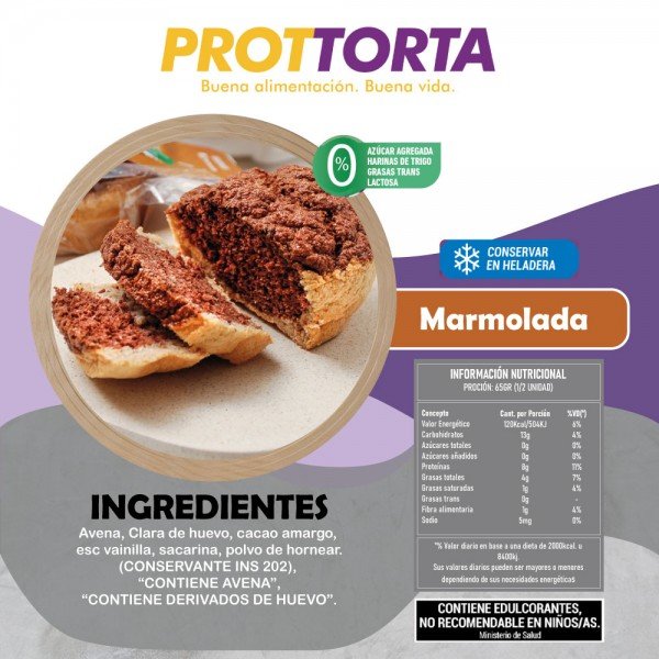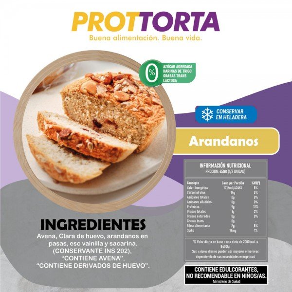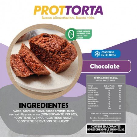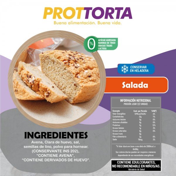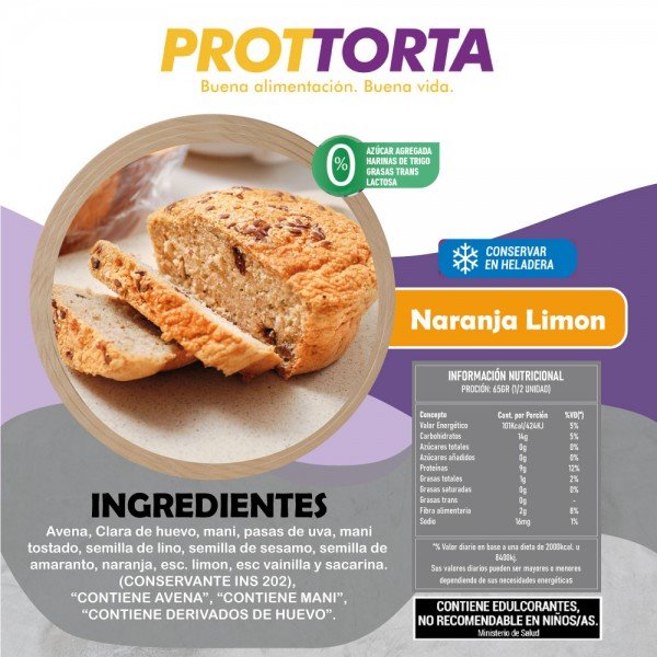 BUENA ALIMENTACIÓN. BUENA VIDA.Prottorta es un panificado elaborado a base de avena y claras de huevo. No contienen grasas trans, harinas de trigo ni azúcares. Es ideal para para reemplazar los malos alimentos tanto en desayunos, como en meriendas y colaciones, acompañadas con alguna infusión. Cubre todos los nutrientes que tu cuerpo necesita en una ingesta, aportando buenos carbohidratos, proteínas y fibras.